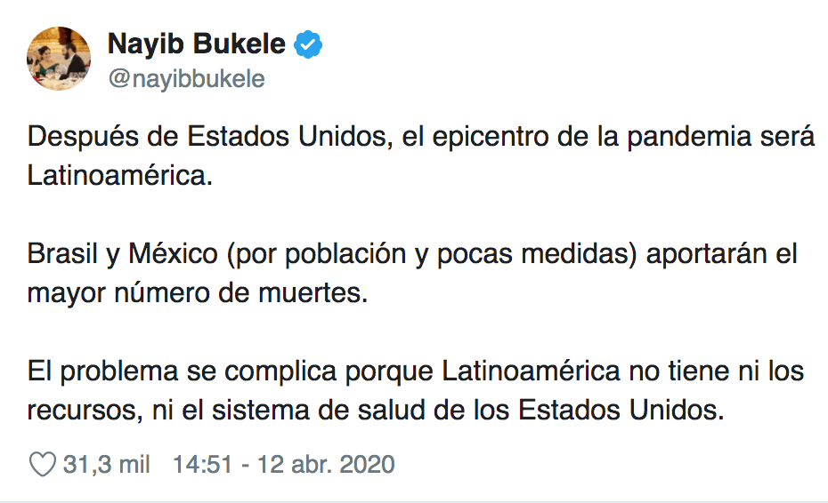 “Después de Estados Unidos, el epicentro de la pandemia será Latinoamérica”, cita parte del tuit publicado por el gobernante.