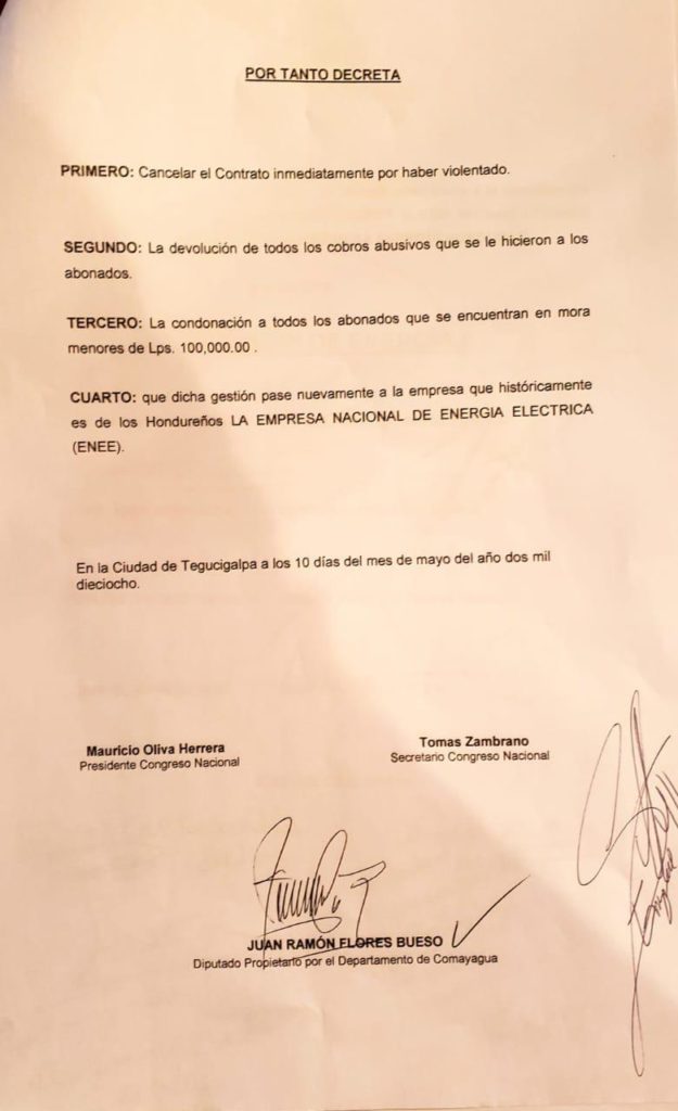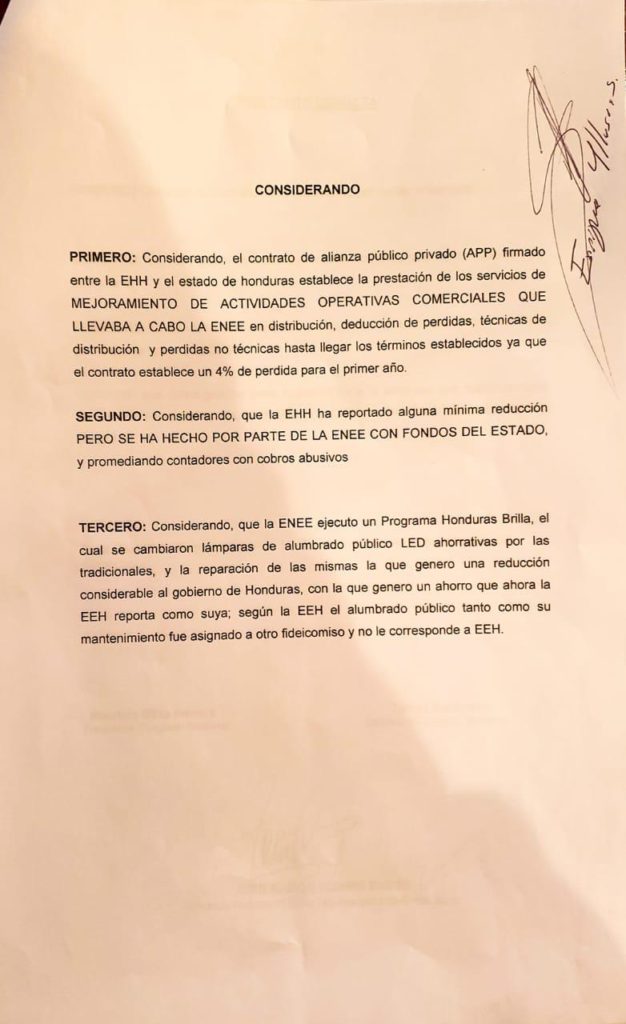 Cabe mencionar que el proyecto para cancelar el contrato a EEH fue presensado por el diputado de Libertad y Refundación (Libre) Juan Ramón Flores.