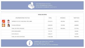 En el recuento rápido inicial, los representantes del Onpe informaban un empate técnico: 50,2% para Castillo y 49,8% para Fujimori, lo que representaba solo cuatro décimas de diferencia, inferior al margen de error estadístico, que se sitúa en torno al 1%.