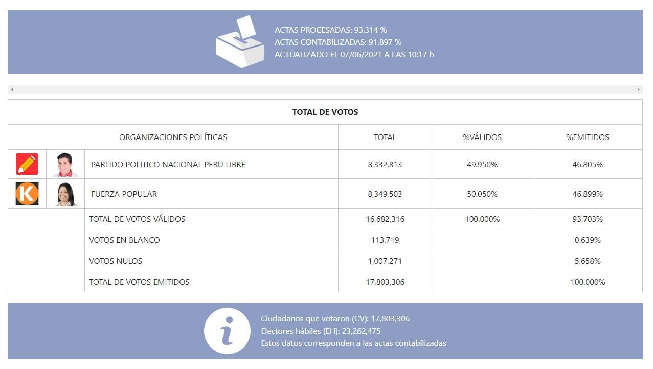 La Oficina Nacional de Procesos Electorales (Onpe) indica que con más del 93% de las mesas escrutadas en Perú, Keiko Fujimori obtiene el 50.0% de los votos, contra el 49.9% del candidato Pedro Castillo.