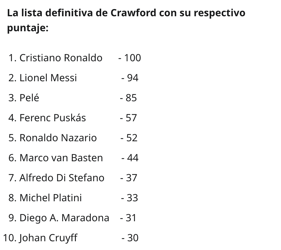 Dicho sistema matemático fue creado por el profesor Tom Crawford y tenía como objetivo elegir al menor futbolista de todos los tiempos.