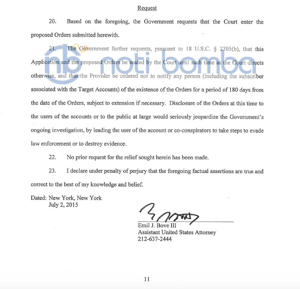En el año del 2015, el Fiscal Auxiliar de los Estados Unidos, Emil J. Bove III hizo la solicitud de confidencialidad en la investigación en curso. El fiscal auxiliar de los EEUU ordenó a esta compañias de tecnología (Apple, Google, Microsoft, Yahoo, AOL) a no revelar a los dueños de las cuentas ni al público en común la existencia de las ordenes de investigación, ya que podrían entorpecer con las investigaciones porque los usuarios de estas, tomarían precauciones para evadir la justicia al destruir evidencias claves.