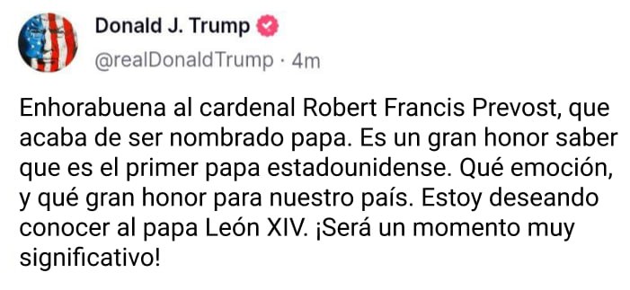 “Enhorabuena al cardenal Roberto Francis Prevost, que acaba de ser nombrado papa. Es un honor saber que es el primer papa estadounidense”, escribió Trump sobre el papa León XIV, quien durante su discurso habló en latín, italiano y español.