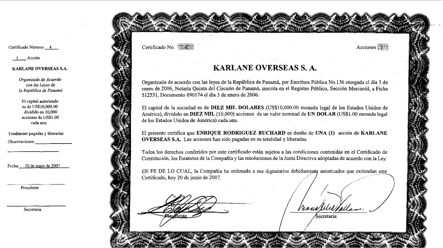 La empresa offshore de Asfura se registró con el nombre Karlane Overseas S.A, ubicada en Panamá en enero del 2006.