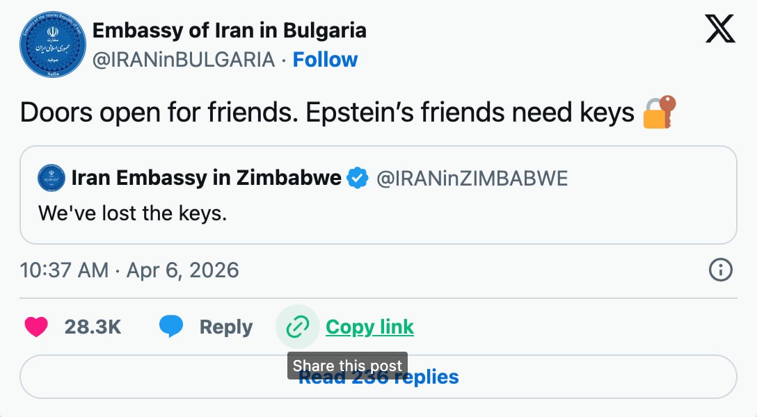 La estrategia ha transformado las cuentas oficiales de las embajadas en plataformas de humor político antiestadounidense y antiisraelí. Por ejemplo, la embajada en Zimbabue respondió a un mensaje agresivo de Trump con la frase “hemos perdido las llaves” y publicó imágenes sarcásticas sobre sistemas de misiles HIMARS con la leyenda “BOOM (izquierda) BOOM (derecha) TEL AVIV”.