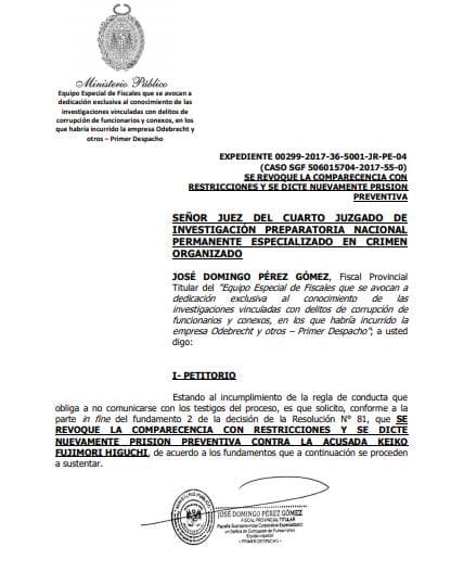 ‘Estando al incumplimiento de la regla de conducta que obliga a no comunicarse con los testigos del proceso, es que solicito que se revoque la comparecencia con restricciones y se dicte nuevamente prisión preventiva contra la acusada Keiko Fujimori’, cita el documento .