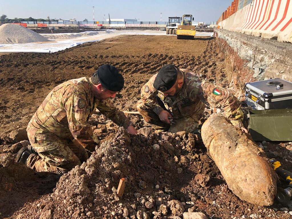El ministerio de Defensa de Italia informó que los expertos del ejército trabajaban para extraer y desactivar las bombas de forma segura, que calculan tienen un peso total de 150 kilogramos (330 libras).