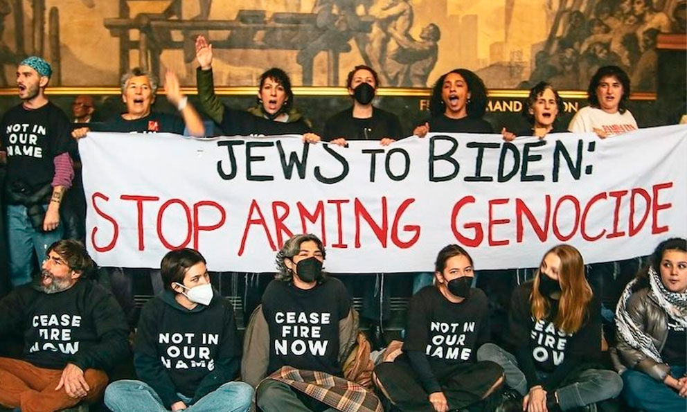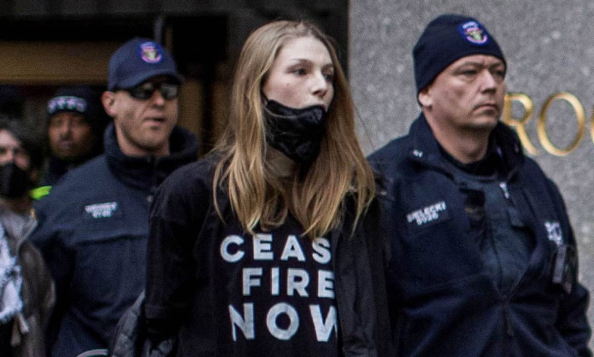 En cierto momento, se observa a Schafer, al igual que muchos otros manifestantes, sentada en el suelo, mientras algunos sostienen una pancarta detrás de ella con el mensaje: “Judíos a Biden: cesen el apoyo al genocidio”.