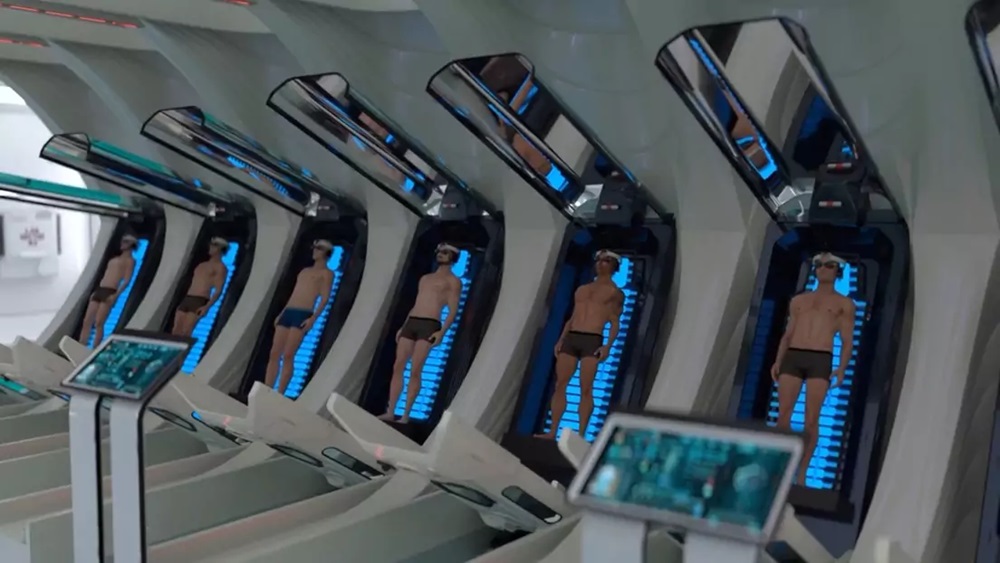 Las cápsulas utilizadas en este proceso muestran a los reclusos de pie, con dispositivos CogniFi en la cabeza, inmersos en recuerdos generados por IA a través de pantallas en los ojos y auriculares en los oídos.