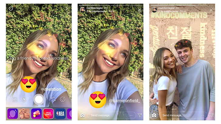 Con el intento de promover la amabilidad entre los usuarios, se han activado nuevas características; el efecto de cámara “kindness” adquiriendolo si se utiliza el modo selfie; el fondo de la pantalla se llenará de corazones y aparecerá un mensaje que anima a extender la amabilidad con otro usuario, con fondos una superposición con mensajes amables en distinto idiomas. Este nuevo aspecto es en colaboración con la bailarina y actriz Maddie Ziegler, al seguir a esta joven en Instagram, el filtro será activado.