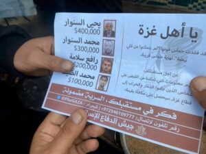 Asimismo, se ofrece una suma de 200.000 dólares por información sobre el comandante del batallón de Jan Yunis, Rafaa Salameh, donde actualmente se están librando los enfrentamientos más intensos entre los milicianos de Hamás y las tropas israelíes. Por último, Mohammed Deif, jefe del ala militar de Hamas, tiene una recompensa de 100.000 dólares. Según los panfletos israelíes, se asegura la confidencialidad de los informantes. Israel sospecha que Yahya Sinwar podría estar escondido en la ciudad de Jan Yunis, a donde presumen que huyó poco después del 7 de octubre, posiblemente mezclado entre los convoyes humanitarios.