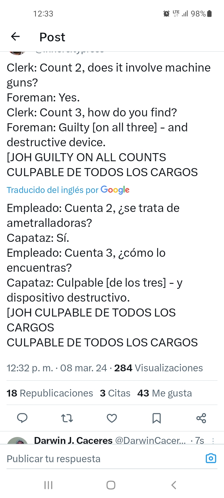 Después de más de 24 horas de deliberaciones, el jurado ha determinado que el expresidente es culpable por conspiración para importar sustancia controlada a los Estados Unidos, usar o portar armas de fuego, ayudar e instigar al uso y el porte y la posesión de armas de fuego y, el último, conspiración para usar o portar armas de fuego incluyendo ametralladoras y dispositivos destructivos.