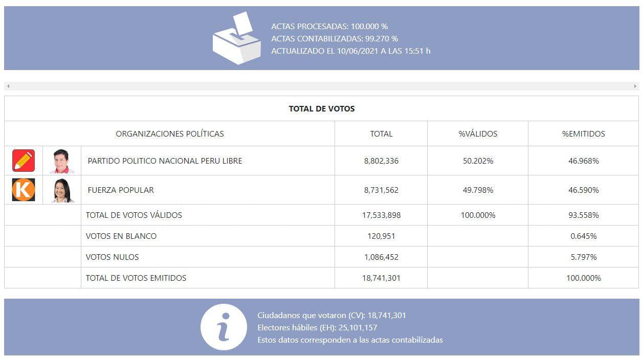 Con el 100 por ciento de las actas procesadas, el partido Perú Libre logró el 50.202% de los votos por encima del 49.708 obtenido por su contrincante Keiko Fujimori.