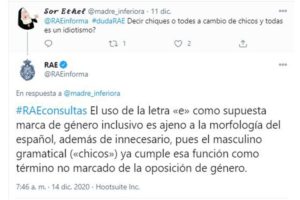 “El uso de la letra ‘e’ como supuesta marca de género inclusivo es ajeno a la morfología del español, además de innecesario, pues el masculino gramatical (’chicos’) ya cumple esa función como término no marcado de la oposición de género”.