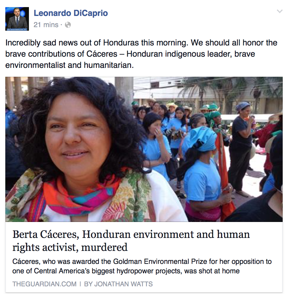 El artista Leonardo DiCaprio mostró su indignacion por la muerte de la hondureña Berta Cáceres. a través de su cuenta oficial de Facebook, compartió la noticia del diario británico The Guardian que habla sobre la muerte de la dirigente indígena reconocida mundialmente por ser una activista del medio ambiente.