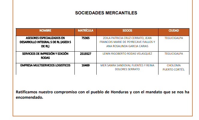 “Asesores especializados en desarrollo integral S DE RL (ASEDI S DE RL): Zoila Patricia Cruz Cerrato, Jea Francios Marie y Ana Rosalinda García Carías”, cita el documento oficial.