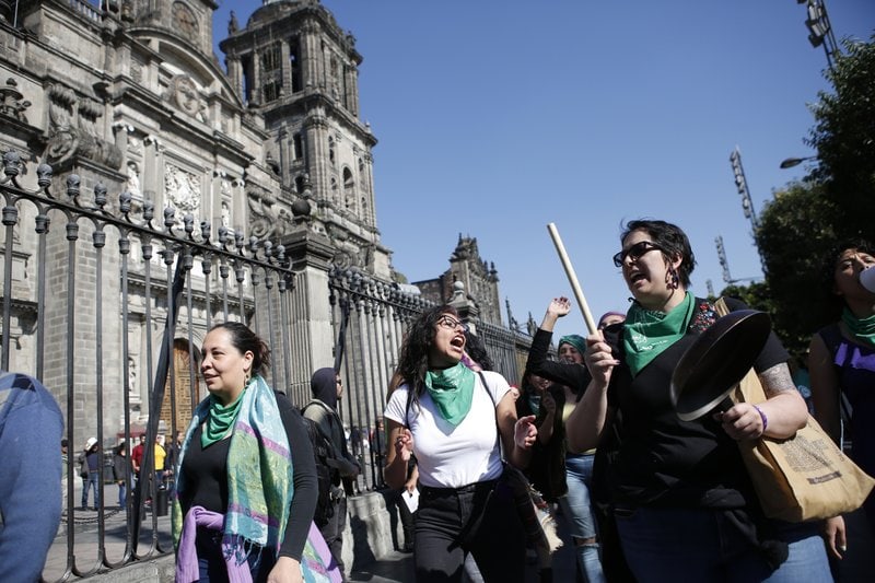CIUDAD DE MÉXICO (AP) — Una docena de mujeres con pañuelos verdes exigieron el domingo la despenalización del aborto y la interrupción segura del embarazo en todo México durante una protesta frente a la Catedral Metropolitana en la capital.
