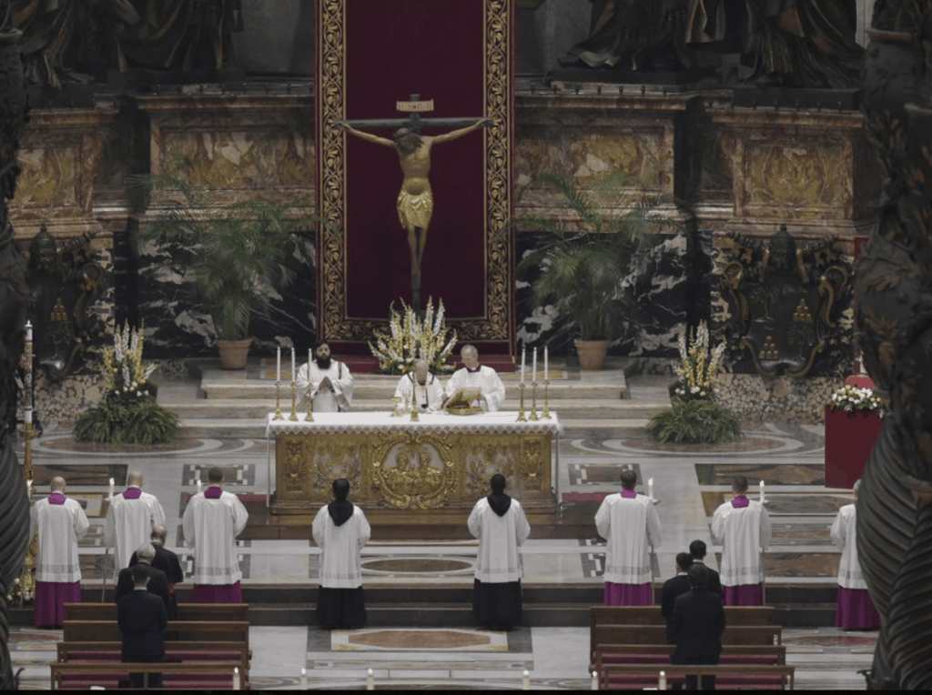 En el Vaticano, Francisco celebró una misa en una Basílica de San Pedro casi vacía, con un puñado de fieles simbólicos sentados uno por banca y con la alabanza de “Kyrios” resonando en los suelos de mármol.