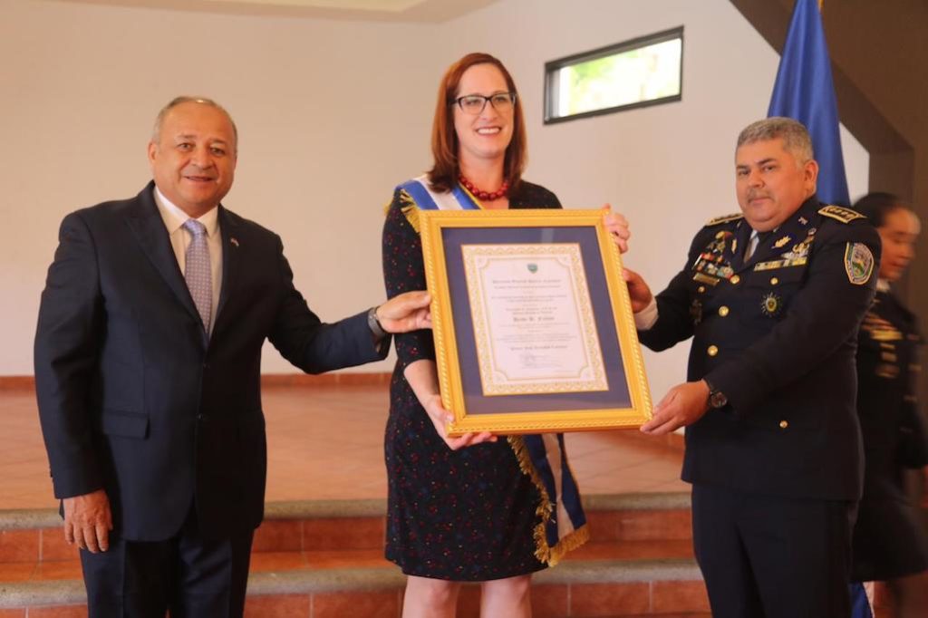 La Policía Nacional de Honduras hizo entrega este martes de la medalla “Prócer José Trinidad Cabañas” a la encargada de negocios de los Estados Unidos (EEUU), Heidi Fulton.