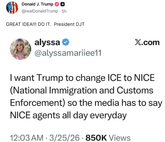 En este contexto de tensión, una propuesta aparentemente humorística surgida en redes sociales ha captado la atención nacional e incluso la del propio presidente Donald Trump. La idea fue planteada por Alyssa Marie, una periodista que se identifica como seguidora del movimiento político conocido como MAGA (Make America Great Again), quien sugirió cambiar el nombre del ICE a “NICE”, acrónimo de “National Immigration and Customs Enforcement”.