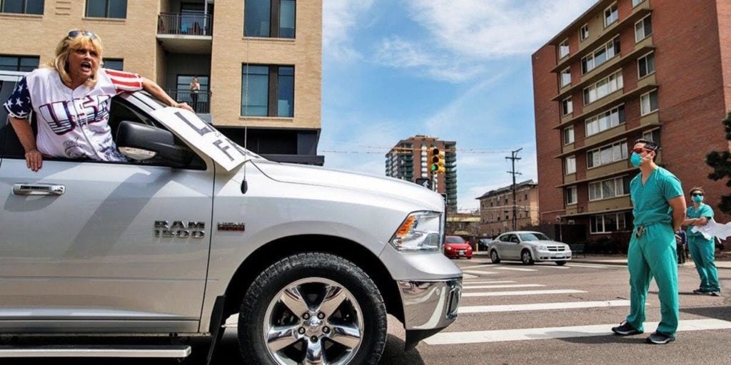 Mientras cientos de personas se reunían en el Capitolio para exigir el fin del cierre en Colorado, doctores y enfermeras obstruían el paso de la manifestación. Los trabajadores de la salud fueron recibidos con insultos y pancartas en contra de las medidas de distanciamiento.