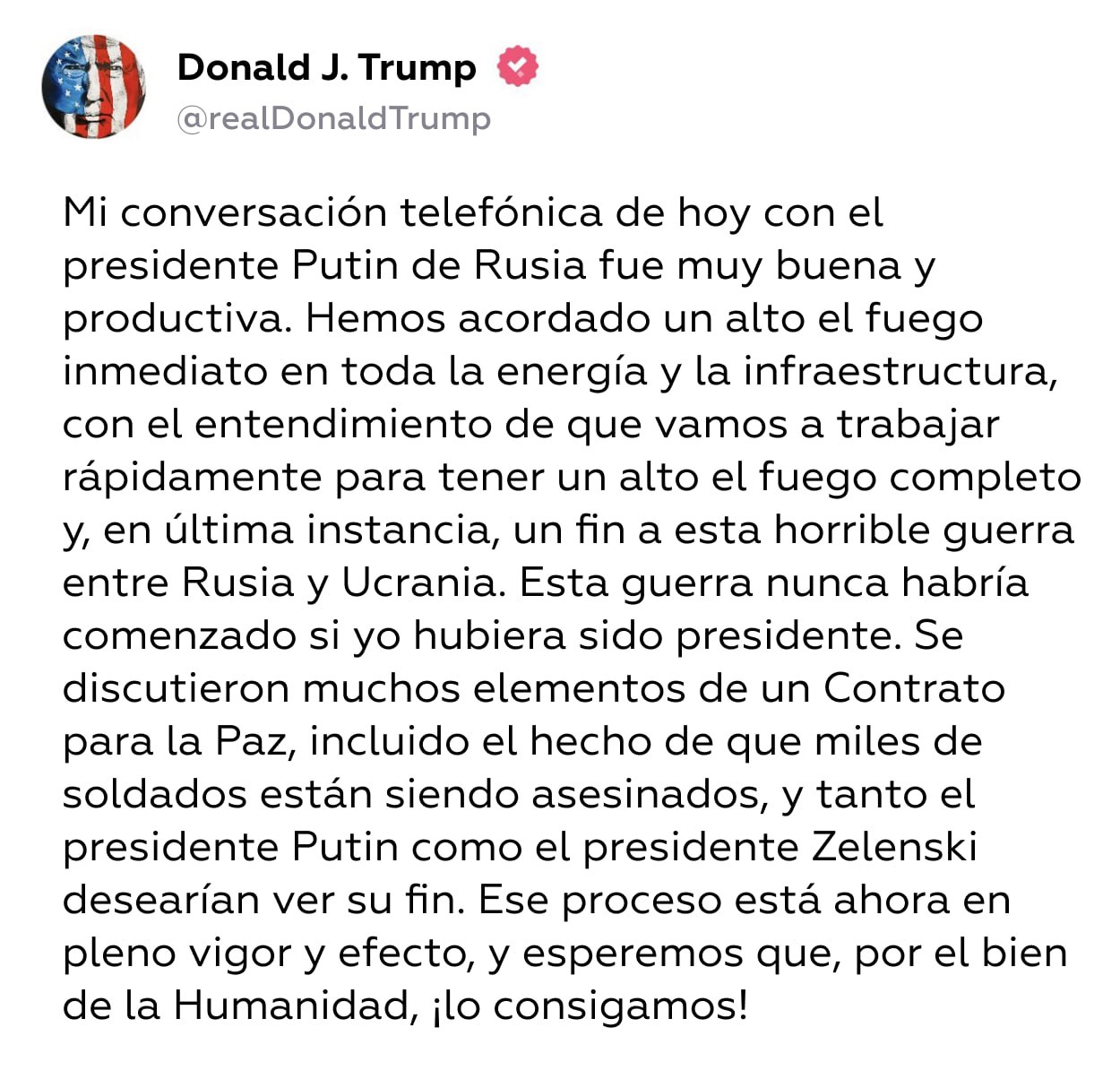 La gestión Trump aprovechó el acuerdo para señalar que la gestión anterior, la de Joe Biden, no trabajó por una paz de buena fe y sincera. “Los líderes acordaron que el movimiento hacia la paz comenzará con un alto al fuego energético y de infraestructura“.