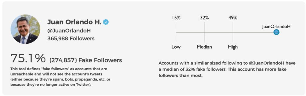Según una plataforma que verifica la autenticidad de los seguidores de las cuentas el 75 por ciento de los seguidores de Hernández son falsos, lo que representa unos 200 mil.