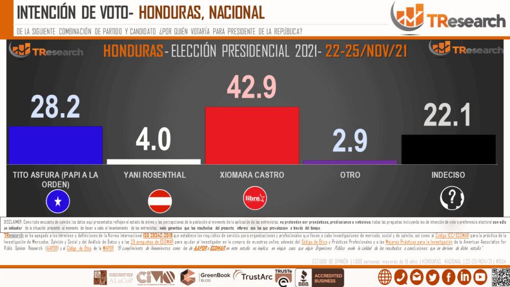 México. La encuestadora de prestigio internacional, TResearch, ha publicado una encuesta en la que la candidata presidencial del Partido Libertad y Refundación (LIBRE) Xiomara Castro, se posiciona 14.7 puntos arriba del candidato del oficialismo Nasry Juan Asfura Zablah. De esta manera Castro, haría historia convirtiéndose en la primera mujer presidenta de Honduras.
