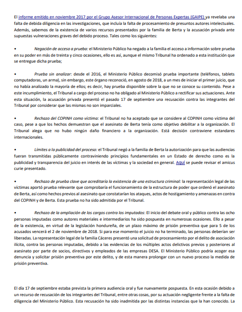 La defensa que lleva el caso de la ambientalista no participa en el juicio después de que el tribunal determinó que había abandonado el proceso y dejó al Ministerio Público como representante de las víctimas.