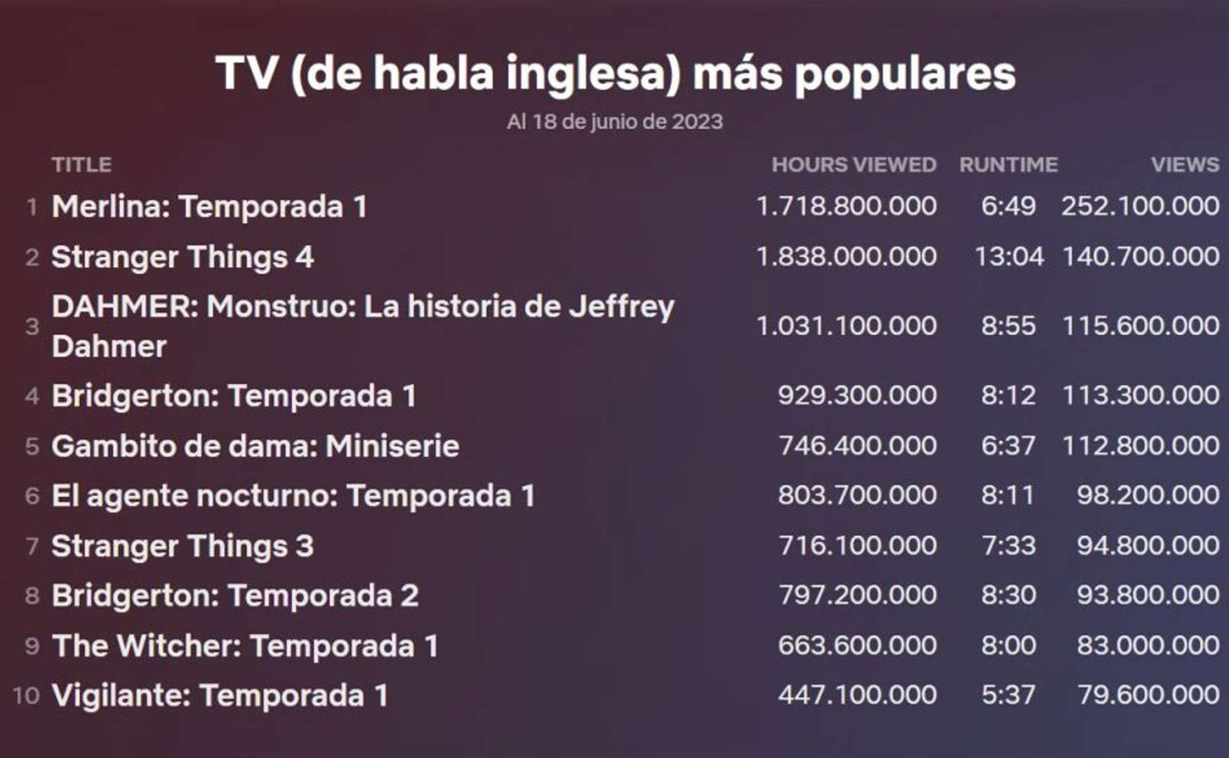 “Merlina temporada 1 alcanzó 252 millones de vistas, mientras que Stranger Things 4 tiene 140 millones de vistas”, se indicó.